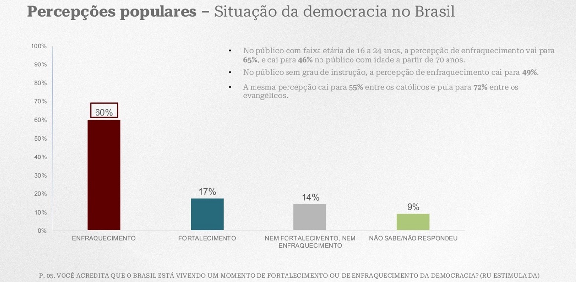 Diante da pergunta “Você acredita que o Brasil está vivendo um momento de fortalecimento ou enfraquecimento da democracia?”, os resultados foram contundentes: