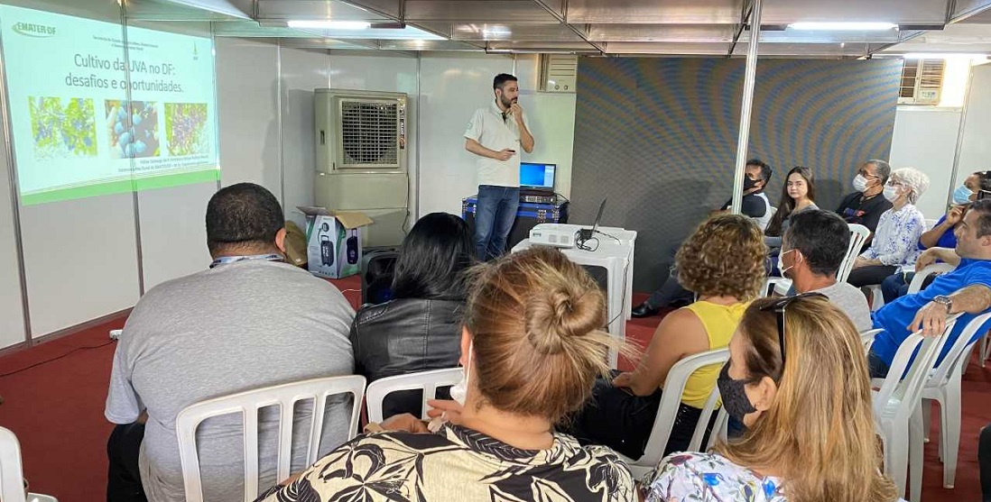 Na Feira Nacional da Uva e do Vinho, realizada em Planaltina-DF, a Emater-DF apresentou os desafios e oportunidades do cultivo da fruta no Distrito Federal para cerca de 50 inscritos. Segundo o coordenador do programa de fruticultura da Emater-DF, Felipe Camargo, apesar de não conseguir competir em área em relação a outros estados, há a oportunidade de produzir uvas de ótima qualidade. “Temos duas estações bem definidas, a chuvosa e a seca, o que permite uma dupla poda, com aumento da produção no período seco e uvas mais doces. No período seco, as frutas absorvem menos água e ficam com maior teor de açúcar, o que é bom tanto para o paladar quanto para a produção de vinho.”