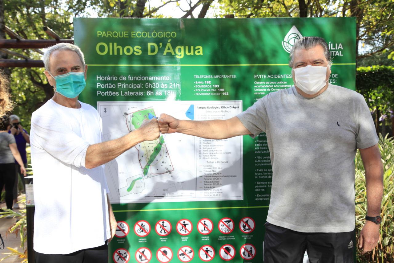 O secretário do Meio Ambiente do DF, Sarney Filho, e o presidente do Brasília Ambiental, Cláudio Trinchão, receberam das mãos do empresário Paulo Octávio, neste sábado (17), a doação oficial de quatro módulos de bicicletário e de 52 placas e totens de sinalização do Parque Ecológico Olhos D’Água, na Asa Norte. É a segunda ação feita pela PaulOOctavio no espaço – em setembro de 2019, a empresa realizou, também sem custos, a reforma do piso da praça central e a recuperação do calçamento intertravado das rampas para deficientes físicos.