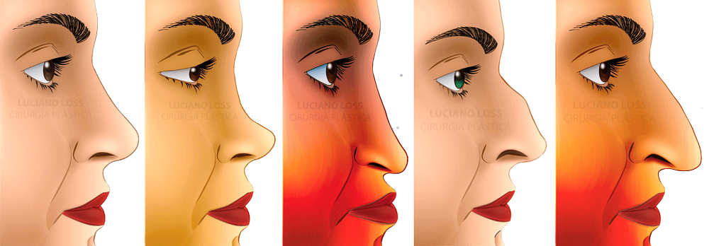 Caucasiano: Normalmente são narizes de cartilagem firme e pele muito fina. Suas principais características são o formato alto e estreito, além de apresentarem, normalmente o dorso alto.