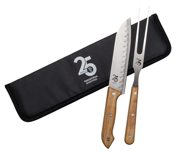 R$ 600,00 = 01 (um) kit churrasco, contendo: estojo com 01 (um) garfo e 01 (uma) faca para churrasco, em aço inox com cabos em madeira.