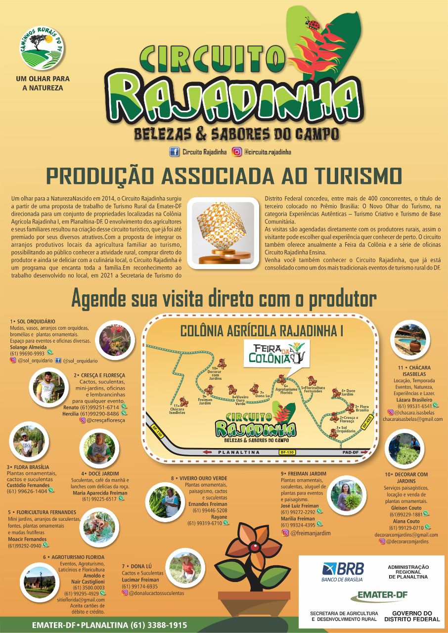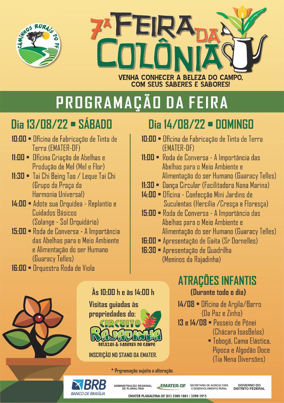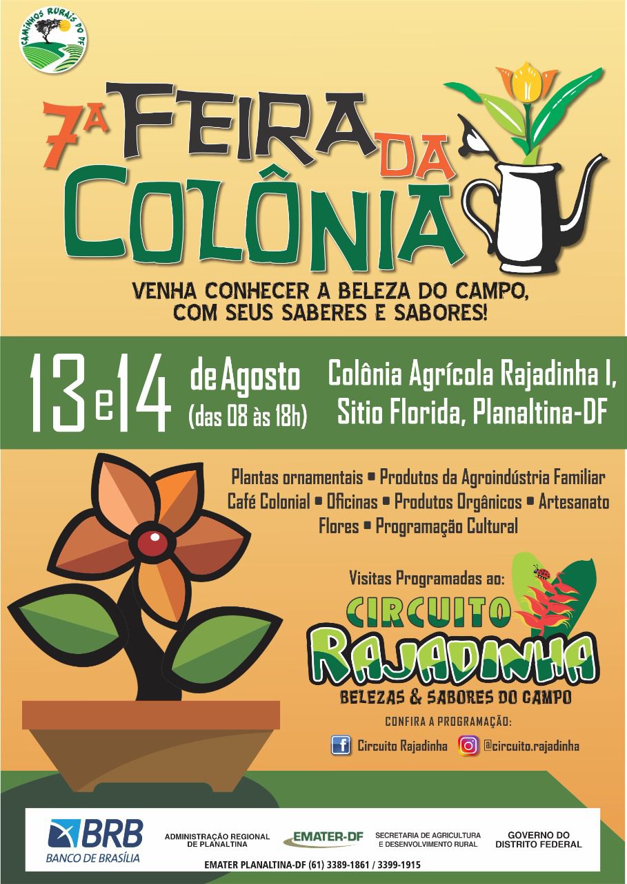 Nos dias 13 e 14 de agosto de 2022, a Emater-DF, em parceria com os produtores rurais do Núcleo Rural Rajadinha, realizam a VII edição da Feira da Colônia – Circuito Rajadinha. A Feira é um evento anual que tem como objetivo promover o Circuito Turístico da Rajadinha, que visa integrar atividades aos arranjos produtivos locais da agricultura familiar, incentivando a comercialização da produção associada ao turismo rural.