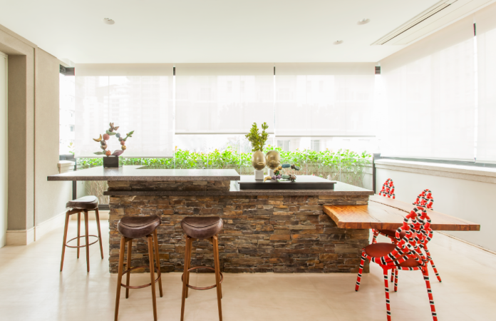 A durabilidade e resistência da pedra madeira a tornam uma escolha prática e esteticamente agradável para áreas externas, como decks e varandas | Projeto de Korman Arquitetos | Foto: Eduardo Pozella |