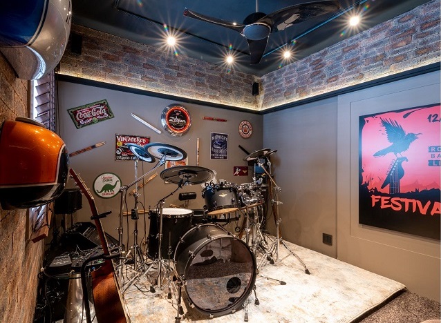 Nesse projeto, a profissional precisava valorizar a paixão que seu cliente sente pelo rock. E como habitar em apartamento requer, ainda mais, o respeito para com os vizinhos no que diz respeito à acústica, seu desafio era montar um estúdio para que ele pudesse praticar sozinho ou reunido com os amigos nas horas vagas.