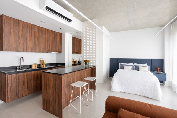 Na cozinha desse studio de 44m², o pau ferro revestiu os armários e a península e, de acordo com a arquiteta Natália de Souza, ele permitiu refletir, de forma refinada, a personalidade do morador.