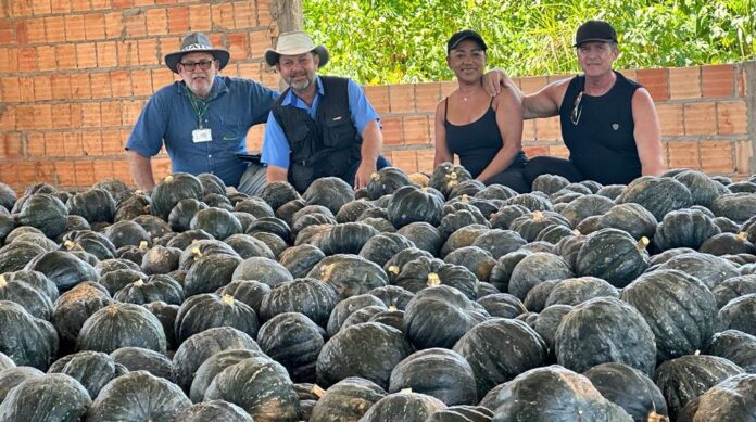 O extensionista Carlos Morais, o produtor Joe Valle, Diana Schappo e Evandro Schappo mostram abóboras colhidas