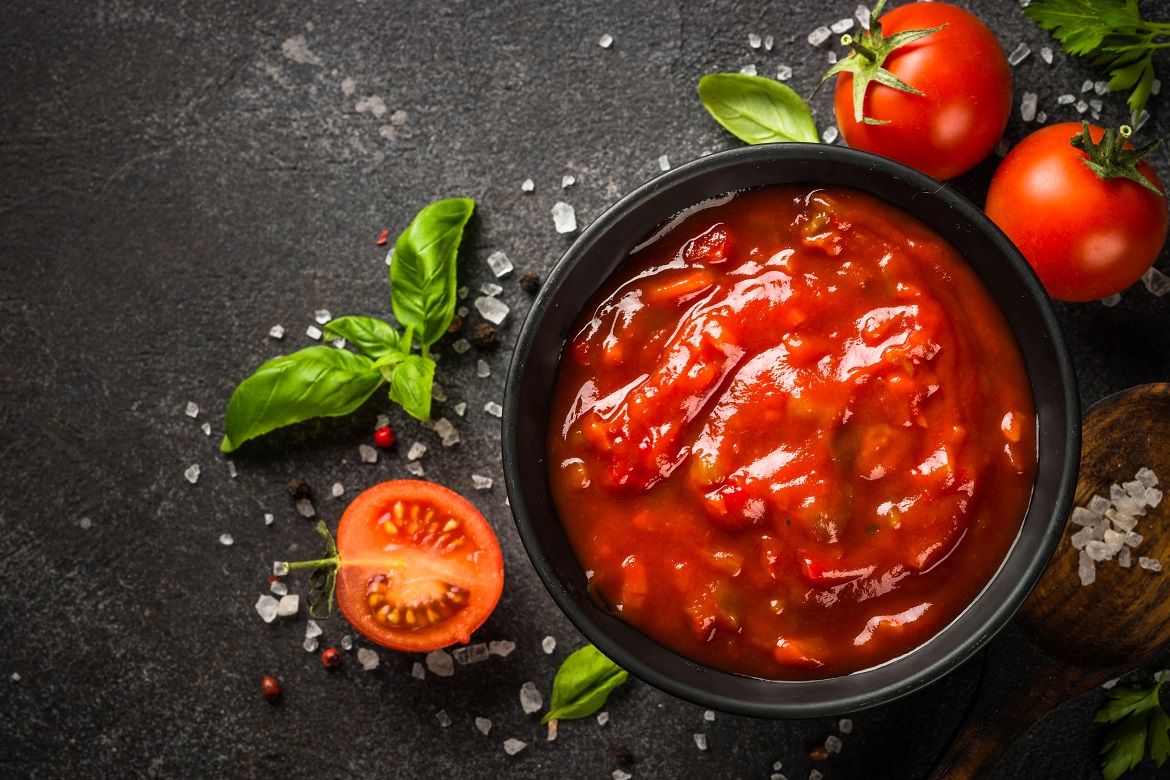 Tomato,Sauce,In,A,Bowl,With,Spices,And,Fresh,Tomatoes.