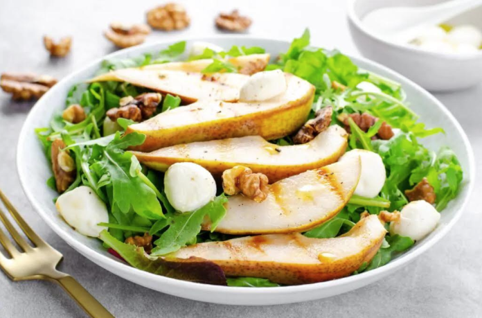 Lave e corte a pera em pequenas fatias e junte as verduras. Acrescente as lascas de queijo e tempere com uma mistura de azeite, vinagre balsâmico e sal a gosto.