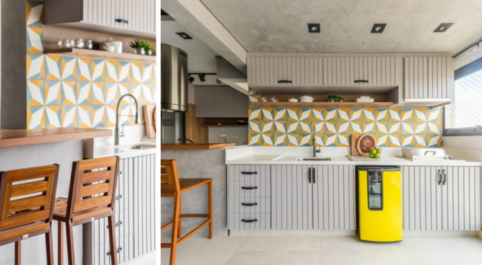 Na varanda gourmet executada pelo arquiteto Bruno Moraes, o ladrilho hidráulico com a estampa que recorda um ‘que’ de retrô. Caracterizado por sua porosidade, o que torna sua instalação mais desafiadora em comparação ao azulejo, o escritório realizou um planejamento cuidadoso da paginação para garantir um resultado estético harmonioso | Foto: Guilherme Pucci |
