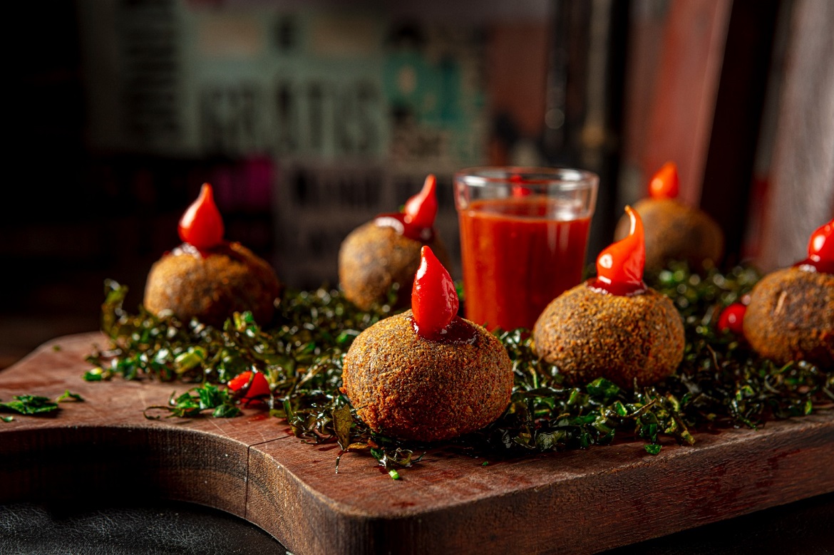 Bolinho de feijoada recheado com bacon e geleia agridoce de bacon