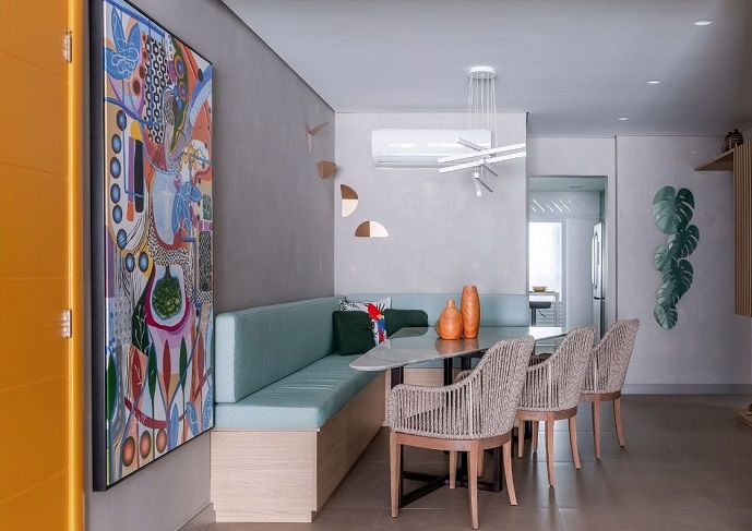 Versatilidade também é um dos adjetivos aplicados ao canto alemão. Além de reverter sua presença em uma circulação mais fluída no ambiente e prover mais assentos em uma sala de jantar pequena, os moradores também são beneficiados por seu espaço interno de armazenamento que faz do móvel um baú discreto. “É incrível como ele resolve mais uma questão do projeto, quando estamos trabalhando com um imóvel compacto. Considerando que todo espaço conta, na sala de jantar esse vão é bem-vindo para guardar travessas ou formas, toalhas de mesa, jogo americano, guardanapos de tecido e outros apetrechos que acompanham o servir… O morador quem decide”, discorre a arquiteta.