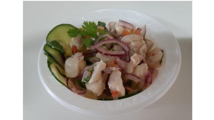 – Coloque em uma vasilha os cubos de peixe, a cebola, a pimenta dedo de moça, o pepino e o sal. Misture tudo com delicadeza;