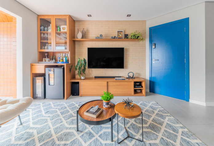 A grande porta azul dessa sala de estar denota a criatividade do arquiteto Bruno Moraes para emanar a juventude e a alegria dos moradores. Na toada de uma arquitetura de interiores com um toque de rusticidade, a estética do tijolinho aparente da parede onde está a TV complementa a proposta | Projeto BMA Studio | Foto: Guilherme Pucci