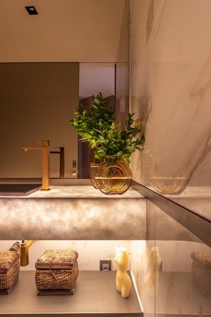 Madeira e pedras naturais compõem juntas a proposta que traz o clássico e moderno, acolhedor e sofisticado em conjunto. O resultado não poderia ser mais encantador: na entrada vemos painel em Bronze Armani, pedra que é vista também no interior da clínica, em bancadas, mesas e cubas. Pedras iluminadas também fazem parte da proposta e estão nos banheiros e áreas da beleza. Já as pedras sintéticas, como o Nano Prime, estão na recepção e área para o café. Esse esplendoroso jogo de cores e paginações é uma das grandes tendências para a decoração de interiores e vem como base de propostas que podem receber estilos de decorações diferenciadas.