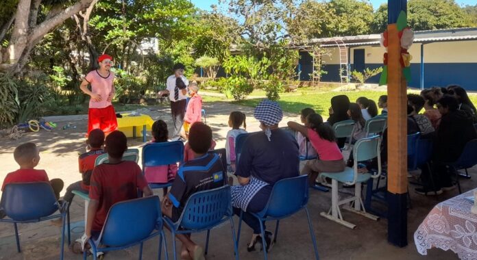 Artistas interagem com a plateia, propondo convivência intergeracional com famílias em situação socioeconômica vulnerável, recebendo entretenimento literário e cidadania