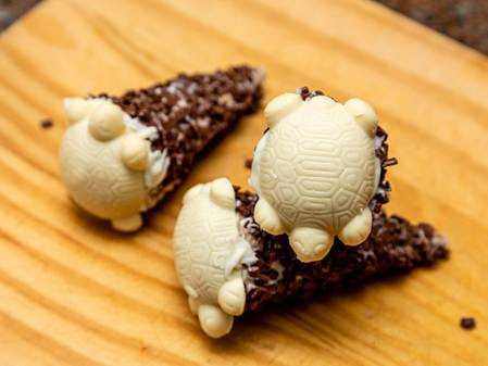 Derreta o chocolate em banho-maria ou no micro-ondas. Caso prefira em banho maria, cuidado para não deixar cair água. Banhe as casquinhas de sorvete com o chocolate derretido por dentro primeiro, (isso não permitirá que o sorvete fique umedecendo a casquinha) escorra e espere secar na geladeira. Agora repita o mesmo processo do lado de fora da casquinha, mas antes de secas passe no granulado. Leve novamente para a geladeira. Após, encha as casquinhas de sorvete e tire o excesso. Coloque uma tartaruga de chocolate por cima.