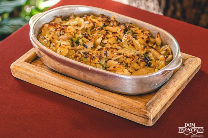 – Bacalhau Prata da Casa – Posta alta de bacalhau preparada ao forno com palmito, batata, rodelas de cebola, tomate, lâminas de alho e azeite extra virgem