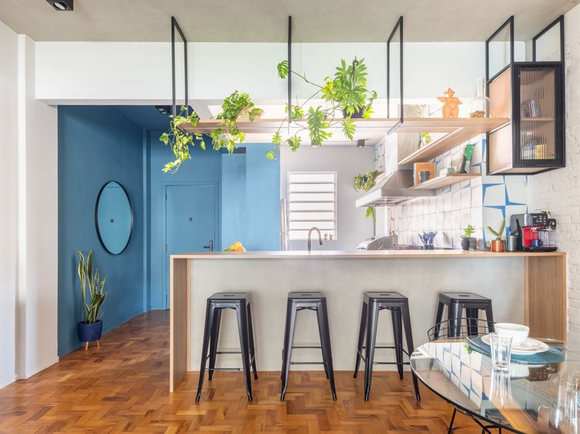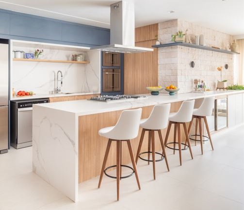 Quando se trata do material mais comum, certamente a madeira, especialmente nos momentos em que se deseja mais aconchego, está no topo da lista. Mas os modelos feitos de metal, com diferentes cores, também estão em alta. Em se tratando da quantidade ideal, tudo vai depender da largura do tampo, da bancada: é preciso tomar cuidado para não criar um ambiente desconfortável, seja pela falta de espaço entre os móveis, seja pela ergonomia em relação ao balcão em si.