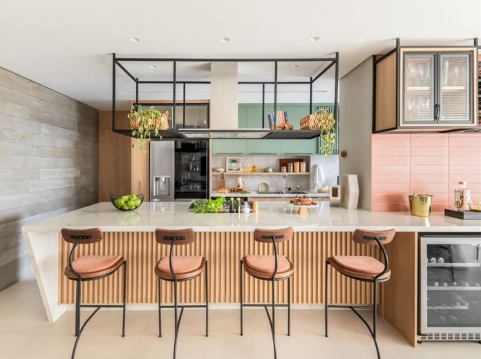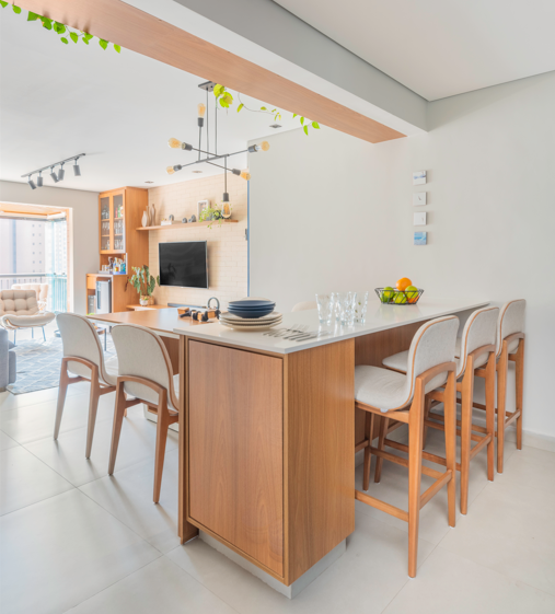 Se o ambiente está conectado à piscina ou poderá receber os moradores com roupas molhadas, o assento e encosto das banquetas altas devem ser feitos de um material impermeável e que, de preferência, seque rapidamente. “Entre os bons exemplos de materiais, temos a corda náutico, os tecidos Acquablock e com proteção contra água e raios-UV”, exemplifica Bruno Moraes.