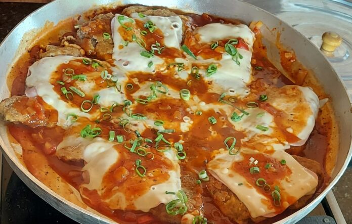 4 – Na mesma paellera doure a cebola e o alho. Junte os tomates e deixe cozinhar por aproximadamente cinco minutos. Depois, acerte o sal, acrescente a pimenta-do-reino e o orégano e deixe cozinhar por mais 3 minutos. Junte os bifes ao molho, colocando-os por baixo do molho. Coloque o presunto e o queijo, tampe a paellera e deixe cozinhar até que o queijo esteja todo derretido.