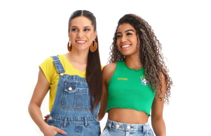Combinação com jeans – Aline veste Jardineira jeans: Youcom; Camiseta amarela: Adidas; Brinco: Forever 21; Sandalia tratorada off: Charlo Calçados. Emilly veste Cropped Brasil: acervo; Calça jeans: Youcom; Tênis branco: Charlo Calçados.