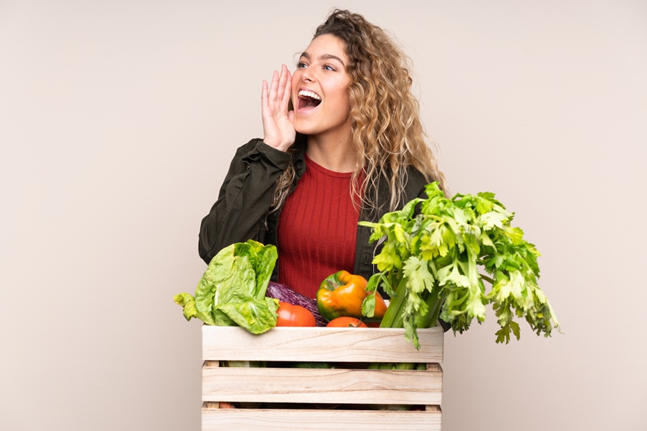 Início Metas de saúde impulsionam consumo de orgânicos no início do ano Farmer with freshly picked vegetables in a box isolated on beige background shouting with mouth wide open