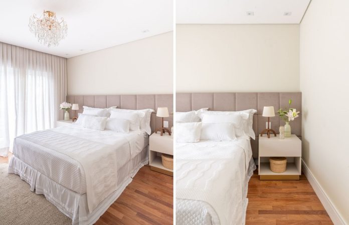 Neste projeto, o piso de taco em tom natural cria unidade visual no quarto, enquanto a iluminação natural valoriza os veios da madeira e reforça a sensação de acolhimento | Projeto Isabella Nalon | Fotos: Julia Herman