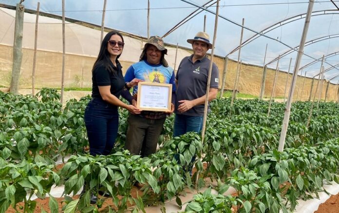 A diretora de Segurança Alimentar e Nutricional da Ceasa-DF, Lidiane Pires, o produtor rural Amaro Nunes e o gerente do escritório da Emater-DF na Taquara, Revan Soares | Foto: Divulgação/Emater-DF