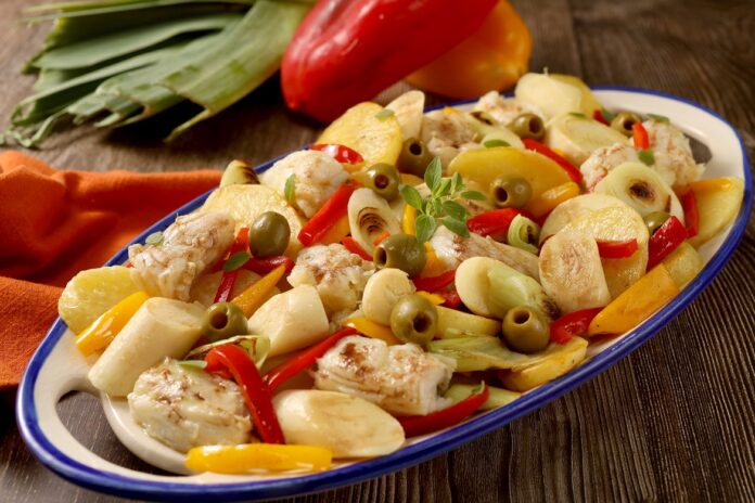 Deixe o bacalhau de molho por 24 horas, na geladeira, mudando a água pelo menos 4 vezes. Retire e corte em pedaços médios. Descasque e cozinhe as batatas até amaciar. Corte em rodelas. Unte um refratário grande com Azeite de Oliva Castelo. Distribua o bacalhau, as batatas, o alho poró, os pimentões, o Palmito Pupunha Castelo e as Azeitonas Verdes Castelo.