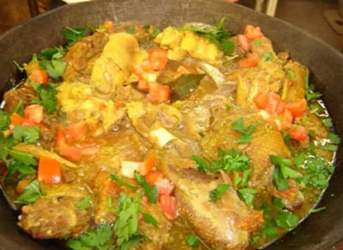 Em outra panela coloque os galos temperados para refogar bem. Junte os tomates, as cebolas, os pimentões, as pimentas e os demais temperos. Refogue mais um pouco, coloque um pouco de água e deixe cozinhar por mais ou menos uma hora e 40 minutos. Junte os pés e deixe cozinhar até que os galos estejam bem cozidos. Guarde parte do coentro e da cebolinha para o final.