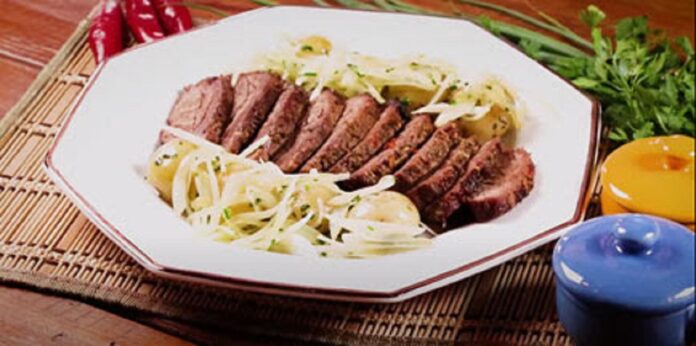 Montagem do Prato: Corte a carne em fatias, coloque em um prato e distribua as batatas com a cebola dos lados. Sirva.