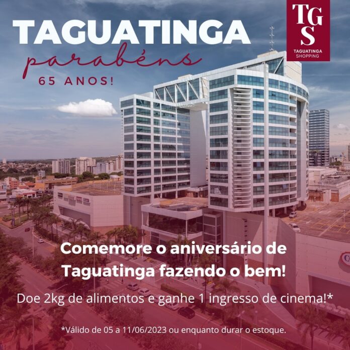 Em homenagem aos 65 anos de história da cidade que acolhe o centro de compras, o Taguatinga Shopping distribuirá, entre os dias 05 e 11 de junho, um ingresso de cinema para cada dois quilos de alimentos não perecíveis doados. Segundo a gerente de marketing, Maíra Garcia, a iniciativa é uma forma de celebrar e, ao mesmo tempo, praticar a solidariedade. “Os alimentos arrecadados serão direcionados para as instituições sociais cadastradas no TGS Solidário. Usaremos a força do shopping e o apoio do público para levar alegria e conforto para diversas famílias do Distrito Federal”, afirma.