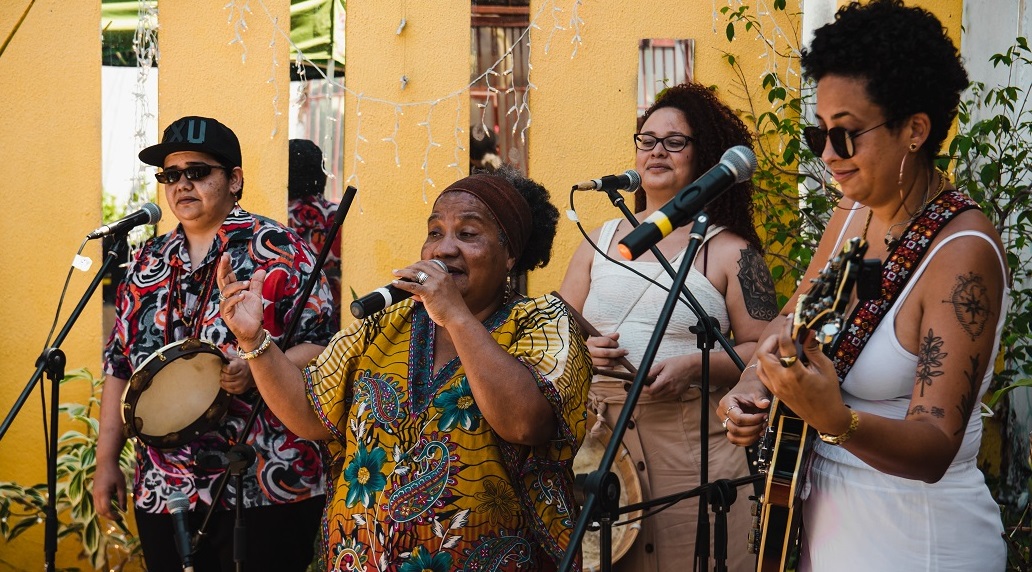 Festival de música convoca diversidade de manifestações culturais consolidadas nas periferias do Distrito Federal, com uma proposta inusitada e inédita de programação. Na foto: Jéssica Caitano, Mestra Martinha, Lirys e Letícia Fialho – Gravação Territórios Sonoros. Crédito: Ricardo Palito