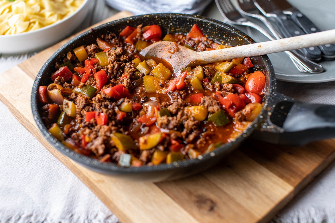 Refogue a cebola e o alho, adicione a carne moída e deixe dourar. Acrescente os legumes, o molho de tomate e os temperos. Cozinhe até os legumes ficarem macios e o molho reduzir. Porcione e congele.