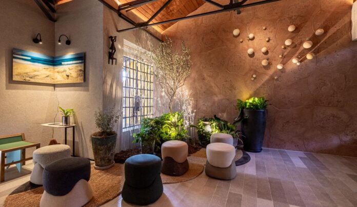 No ambiente que apresenta na mostra, Luciana apostou em pequenos pufes na área de estar. Por se tratar de um espaço de passagem, os assentos individuais oferecem praticidade sem interferir na circulação, além de garantir privacidade aos visitantes que desfrutam um momento de descanso rápido.